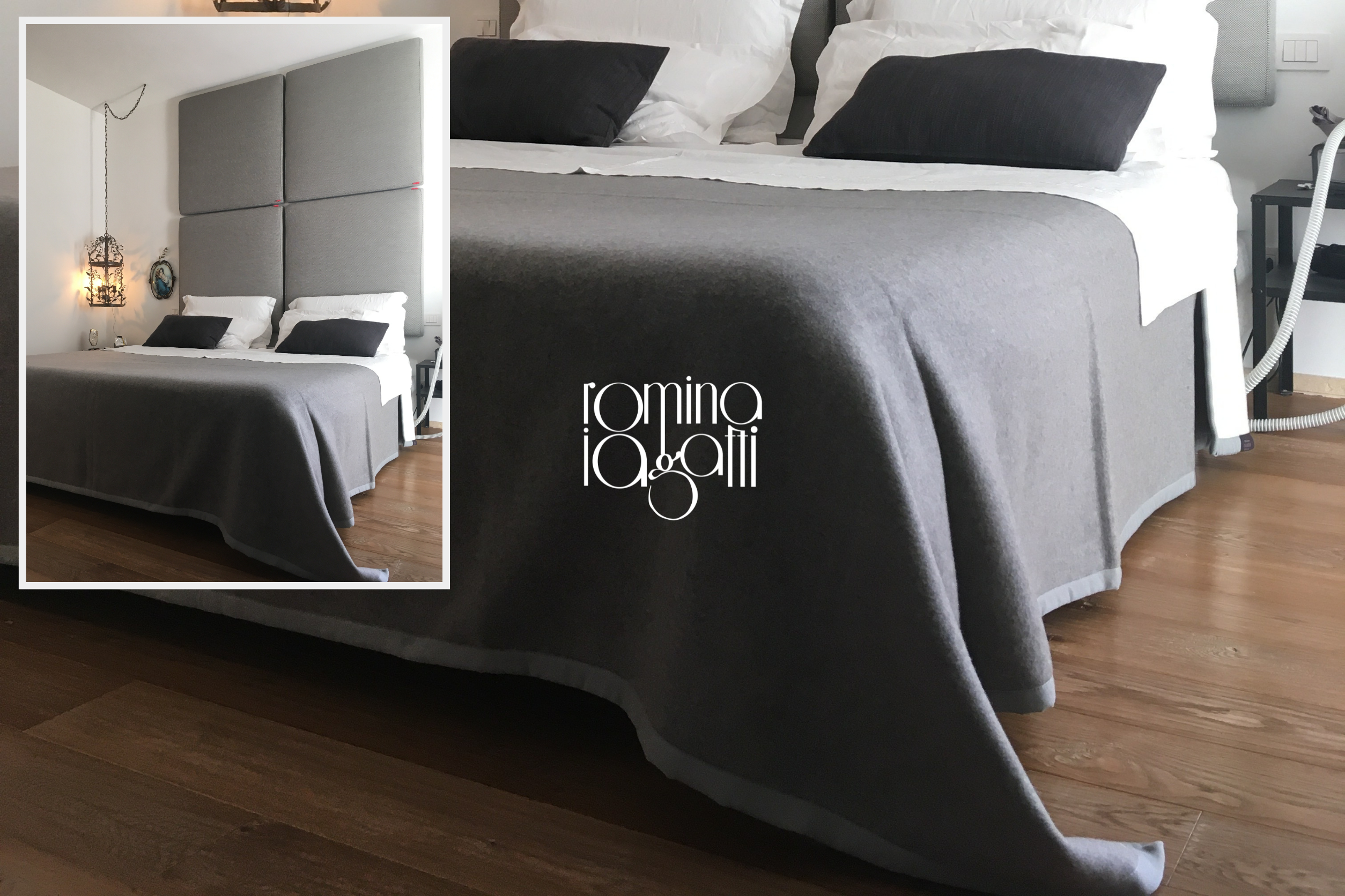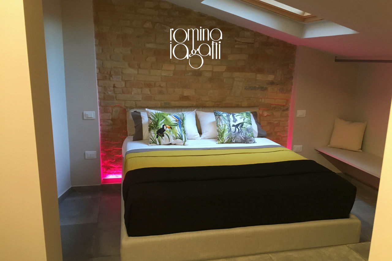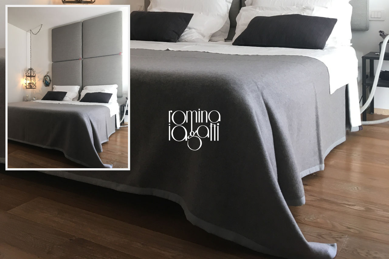 Inoltre, si possono realizzare copriletti su misura, come quello che vedi nella foto qui sotto, studiato per valorizzare i colori già presenti nella camera e rispettarne l'identità.