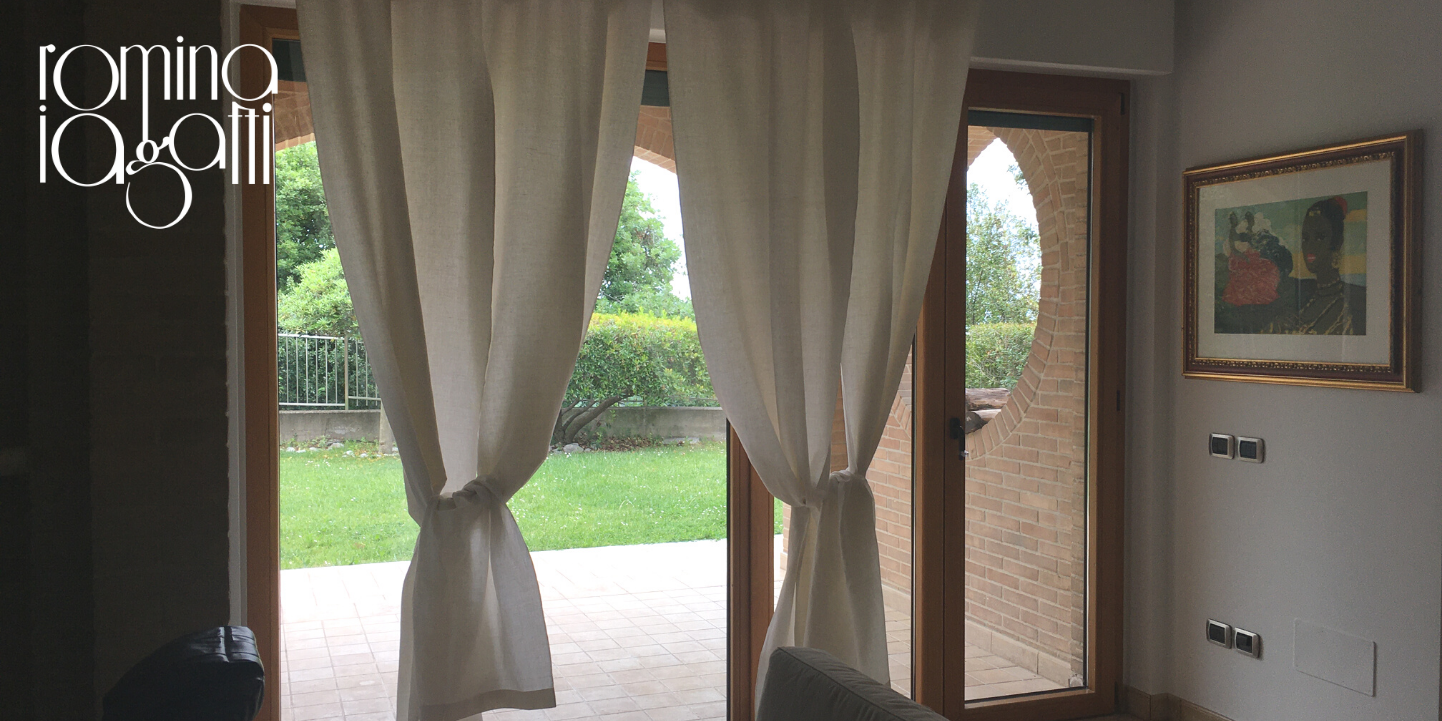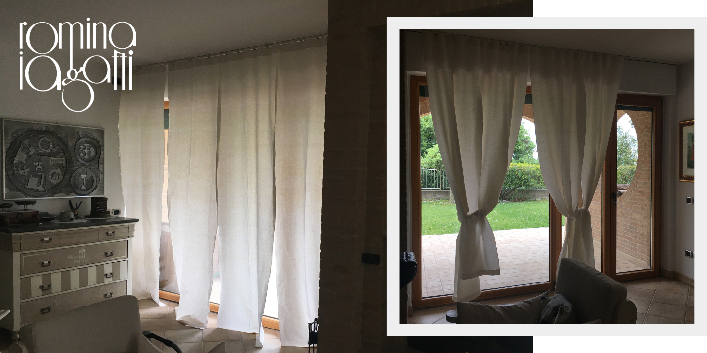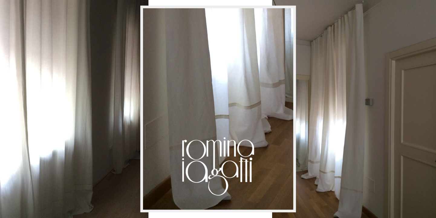 Nel mio progetto, l'idea è stata di lasciare liberi e indipendenti questi teli e valorizzare le cimose, per cui i teli sono confezionati solo nella parte alta dove si cuce una fascia per agevolare lo scorrimento della tenda e un piccolo orlino a terra.