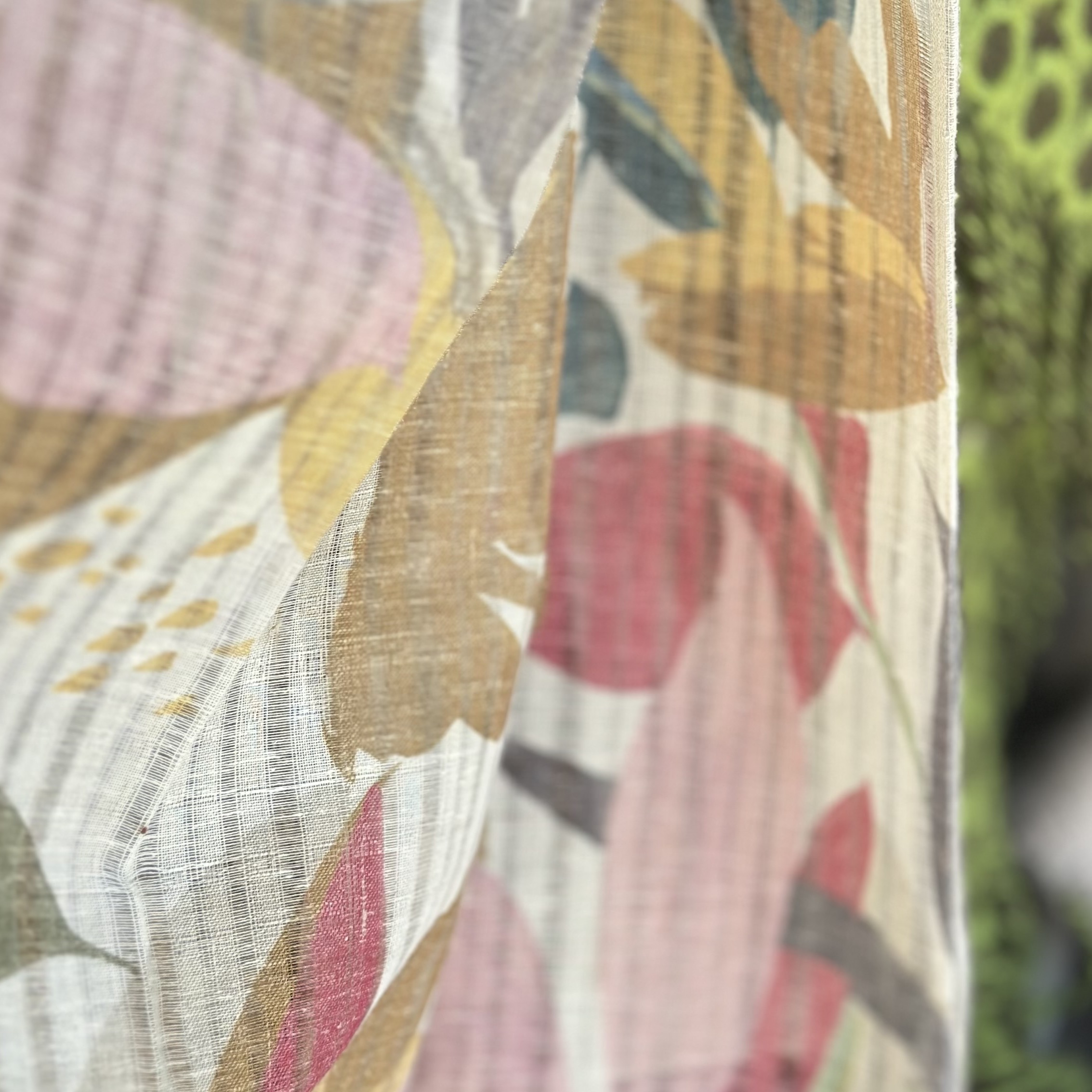 DESCRIZIONE:Un disegno floreale baciato dal sole. Racchiude un tocco di temperamento che ricorda il giardino d’estate. Il tessuto in filato misto con percentuale di fibre naturali rende SUMMER un tessuto rilassato. Un ulteriore colpo d'occhio: le strisce nel tessuto di base sono di vario spessore con le trasparenze che apportano un tocco in più.